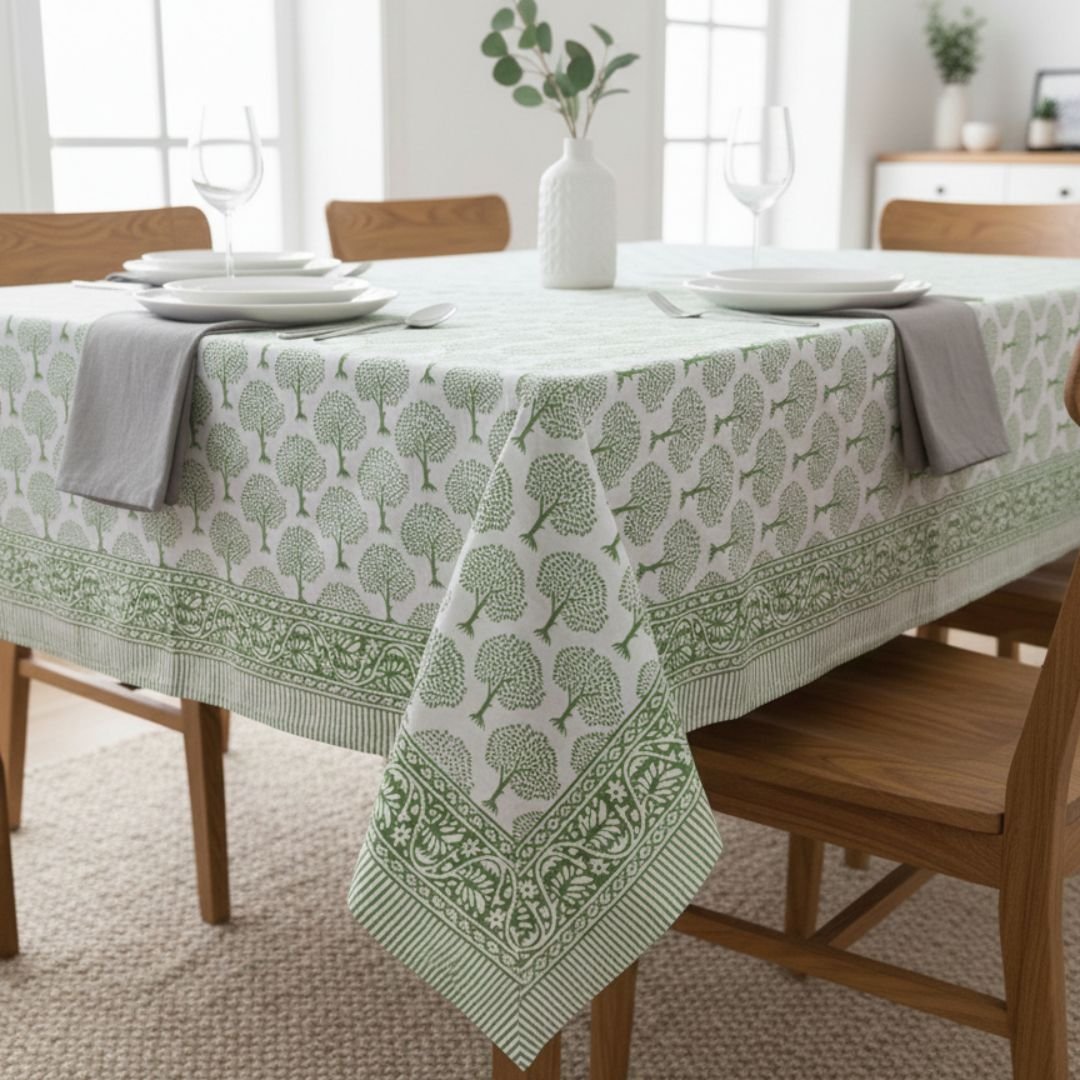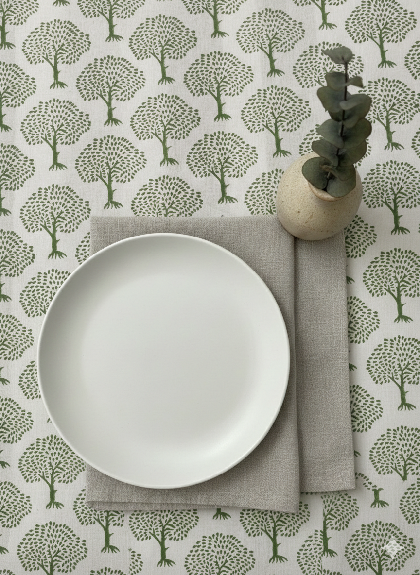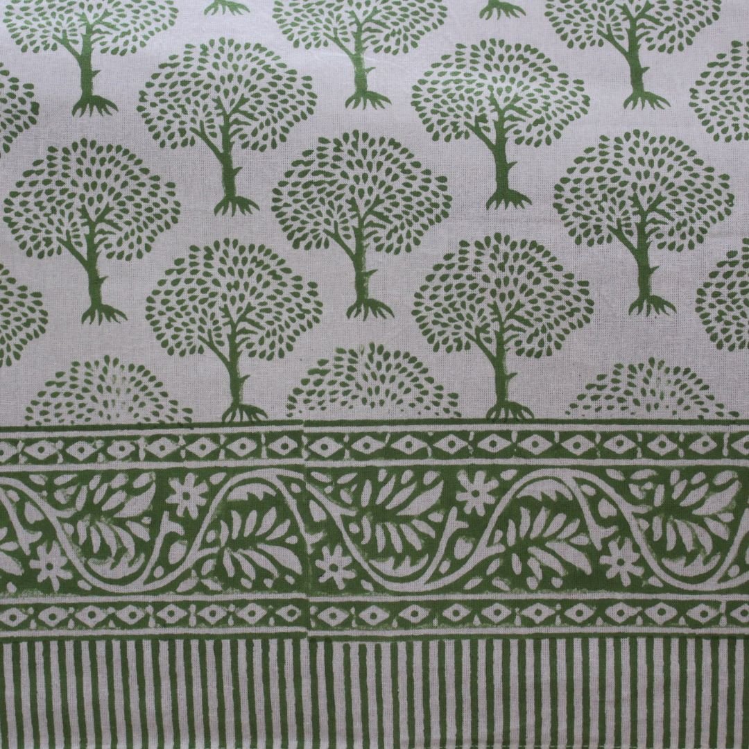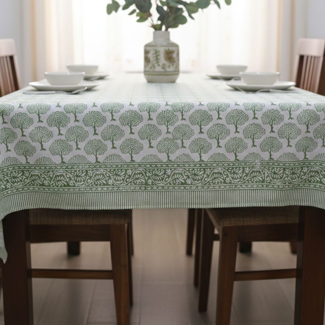 This Hand Block Printed Tablecloth features the design uses small, stylized trees with a slim trunk and a rounded canopy made of tiny leaf marks, giving it a light, airy look.
