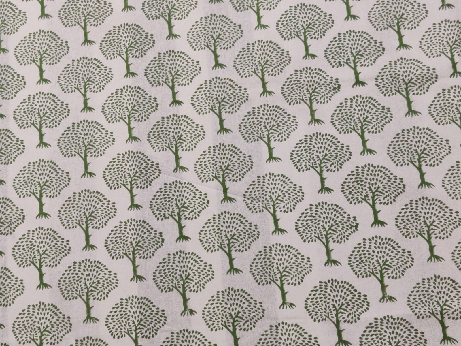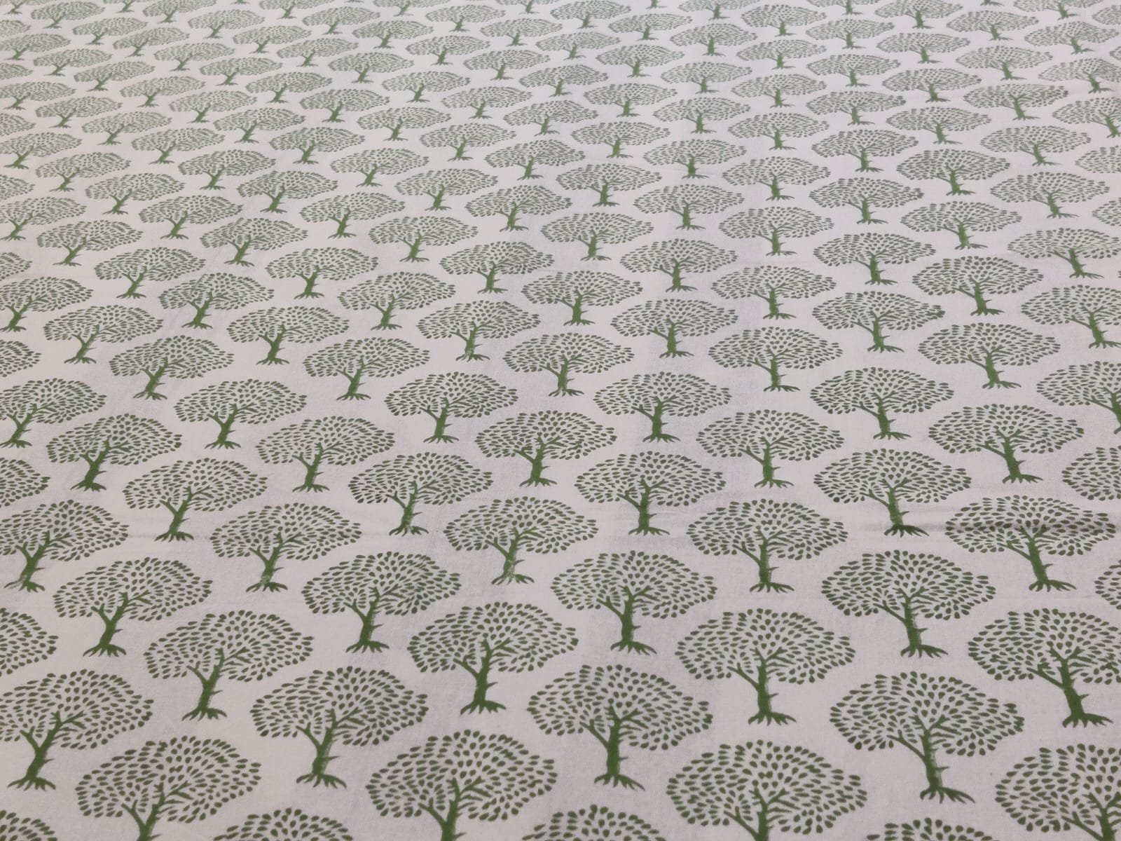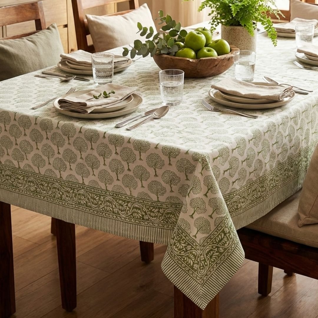 This Hand Block Printed Tablecloth features the design uses small, stylized trees with a slim trunk and a rounded canopy made of tiny leaf marks, giving it a light, airy look.